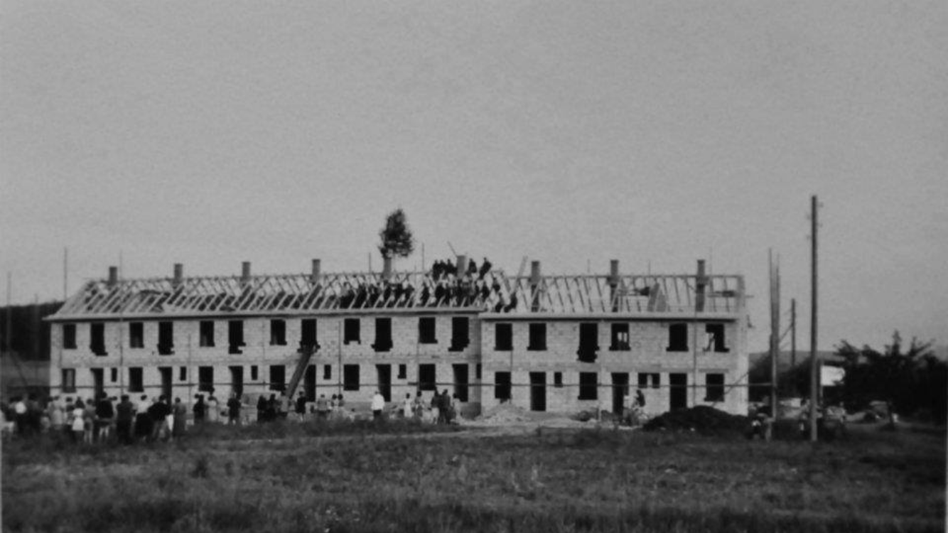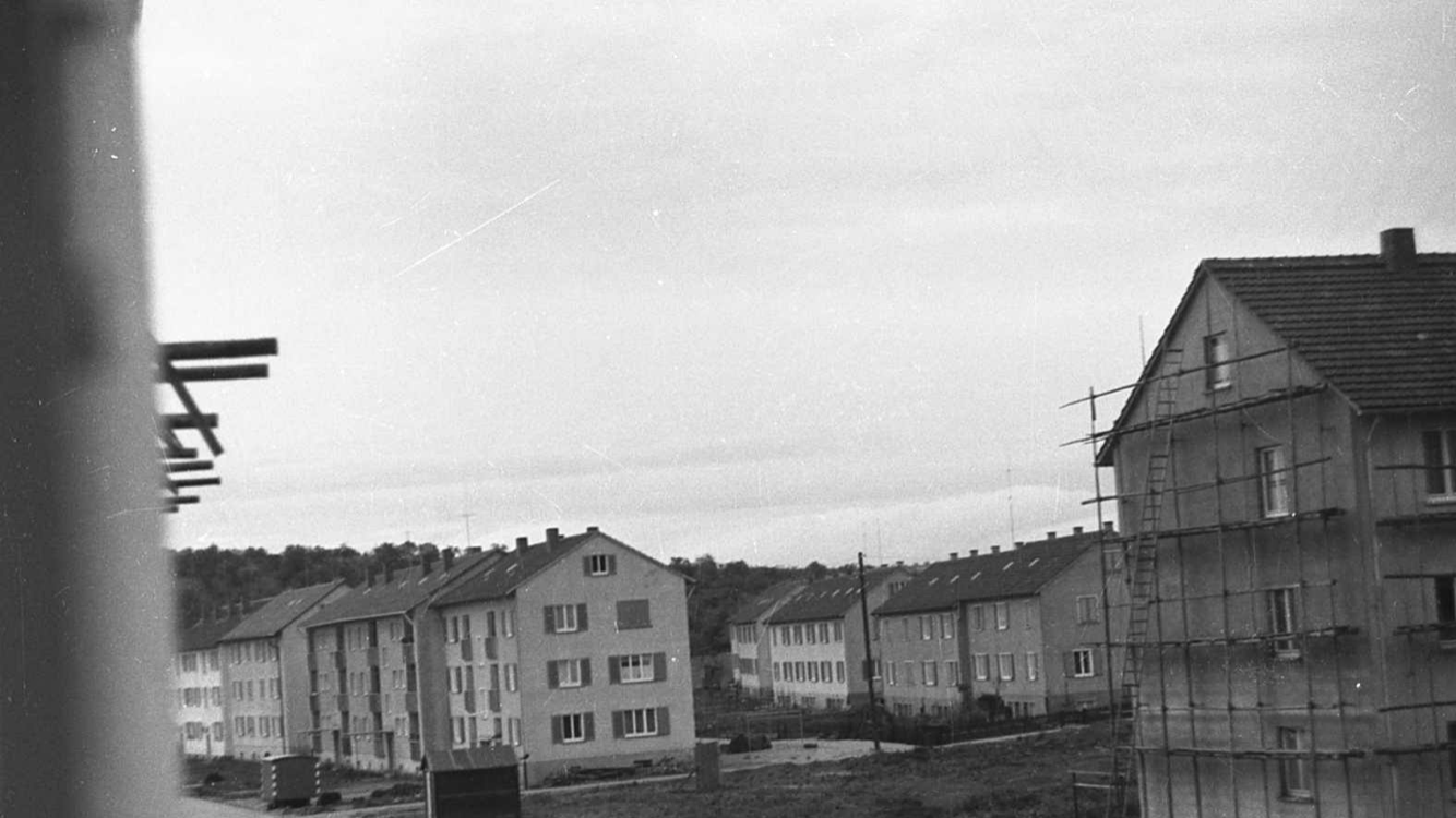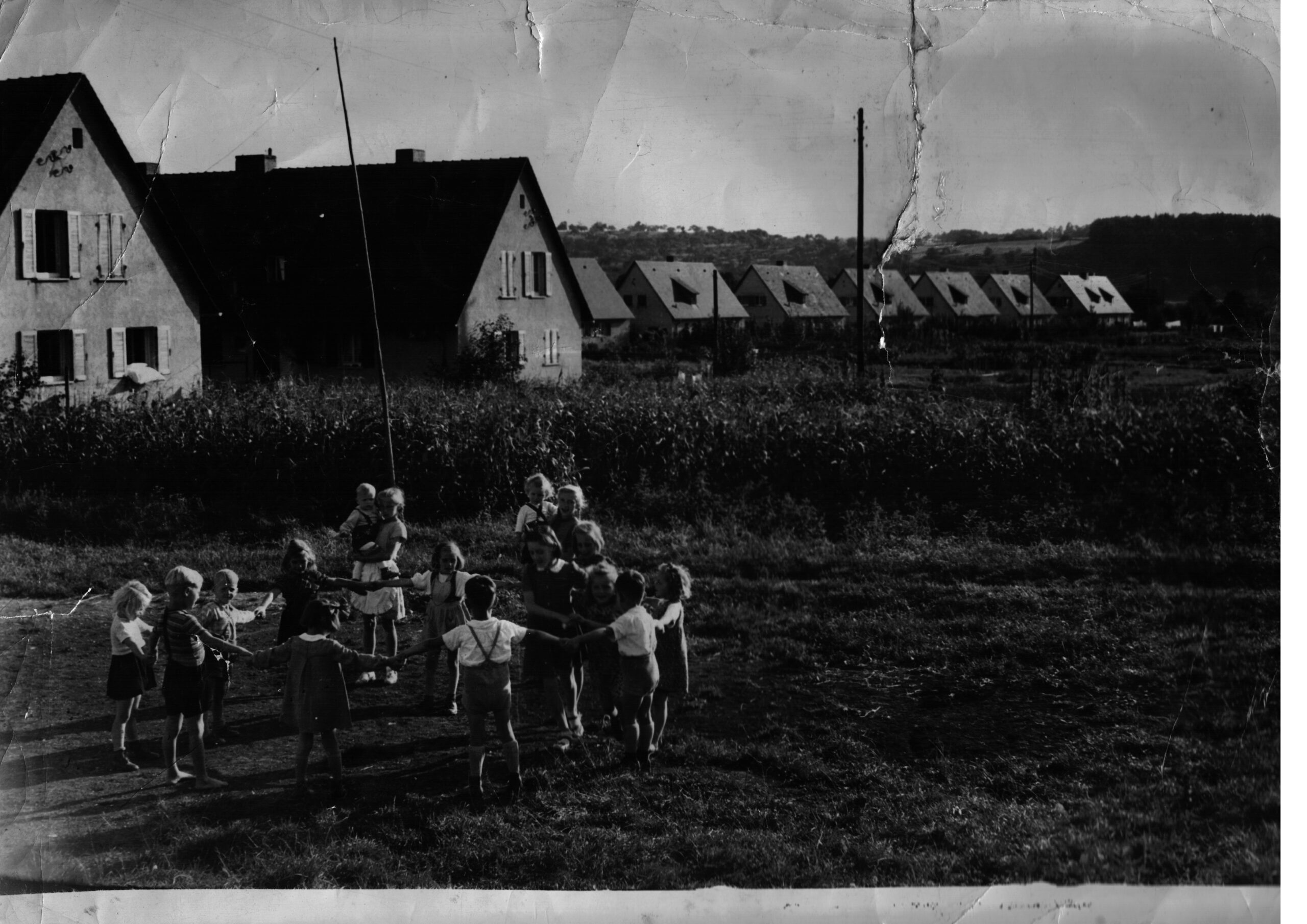 Aufnahme ca. 1947/48, unser Spielplatz zwischen der heutigen Braikestraße und den Häusern der Staufenstraße an der Scheune, von uns „Schopf“ genannt.